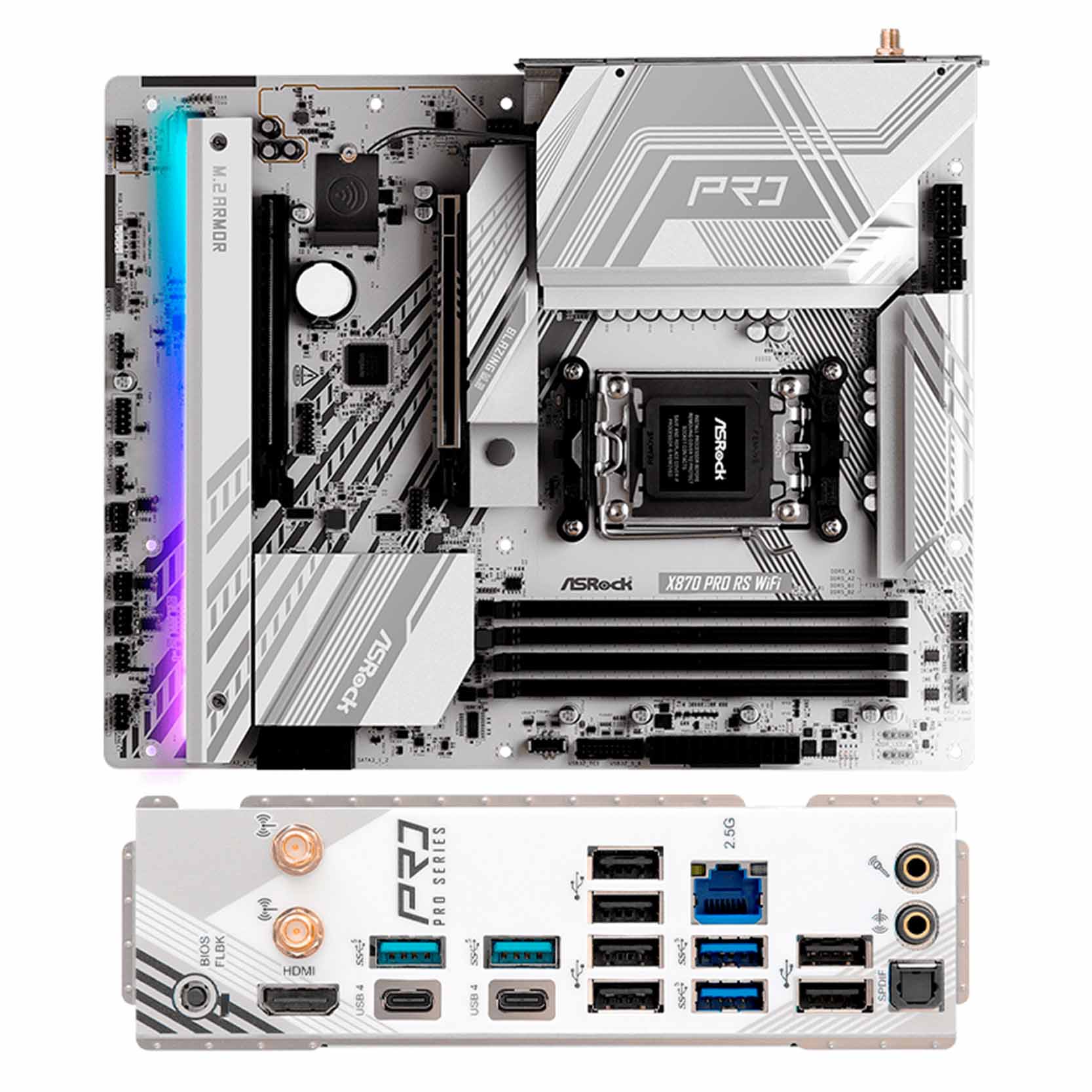 <table style="height: 2086px; width: 55.4905%;" border="1" width="379" cellspacing="1" cellpadding="1"> <tbody> <tr> <td style="width: 27.566%;" rowspan="1"><span style="font-size: 8pt;">MARCA</span></td> <td style="width: 72.2874%;" colspan="3" height="21"><span style="font-size: 8pt;">ASROCK</span></td> </tr> <tr></tr> <tr> <td style="width: 27.566%;" rowspan="1"><span style="font-size: 8pt;">MODELO</span></td> <td style="width: 72.2874%;" colspan="3" height="21"><span style="font-size: 8pt;">X870 Pro RS WiFi</span></td> </tr> <tr></tr> <tr> <td style="width: 27.566%;" rowspan="1"><span style="font-size: 8pt;">CHIPSET</span></td> <td style="width: 72.2874%;" colspan="3" height="21"><span style="font-size: 8pt;">AMD X870</span></td> </tr> <tr></tr> <tr> <td style="width: 27.566%;" rowspan="1"><span style="font-size: 8pt;">TIPO DE SOCKET</span></td> <td style="width: 72.2874%;" colspan="3" height="21"><span style="font-size: 8pt;">AM5 AMD</span></td> </tr> <tr></tr> <tr> <td style="width: 27.566%;" rowspan="1"><span style="font-size: 8pt;">PROCESADORES</span></td> <td style="width: 28.2991%;" rowspan="1" height="21"><span style="font-size: 8pt;">AMD COMPATIBLE</span></td> <td style="width: 43.9883%;" colspan="2" height="21"><span style="font-size: 8pt;">Procesador AMD Ryzen 9 SAM5 9XXX</span><br><span style="font-size: 8pt;">Procesador AMD Ryzen 7 SAM5 9XXX</span><br><span style="font-size: 8pt;">Procesador AMD Ryzen 5 SAM5 9XXX</span><br><span style="font-size: 8pt;">Procesador AMD Ryzen 3 SAM5 9XXX</span><br><span style="font-size: 8pt;">Procesador AMD Ryzen 3 SAM5 8XXX</span><br><span style="font-size: 8pt;">Procesador AMD Ryzen 9 SAM5 8XXX</span><br><span style="font-size: 8pt;">Procesador AMD Ryzen 7 SAM5 8XXX</span><br><span style="font-size: 8pt;">Procesador AMD Ryzen 5 SAM5 8XXX</span><br><span style="font-size: 8pt;">Procesador AMD Ryzen 9 SAM5 7XXX</span><br><span style="font-size: 8pt;">Procesador AMD Ryzen 7 SAM5 7XXX</span><br><span style="font-size: 8pt;">Procesador AMD Ryzen 5 SAM5 7XXX</span></td> </tr> <tr></tr> <tr> <td style="width: 27.566%;" rowspan="5"><span style="font-size: 8pt;">MEMORIAS RAM</span></td> <td style="width: 28.2991%;" rowspan="1" height="21"><span style="font-size: 8pt;">COMPATIBLES</span></td> <td style="width: 43.9883%;" colspan="2" height="21"><span style="font-size: 8pt;">Memoria RAM DDR5 8200 MHz PC5-65600</span><br><span style="font-size: 8pt;">Memoria RAM DDR5 7600 MHz PC5-60800</span><br><span style="font-size: 8pt;">Memoria RAM DDR5 7200 MHz PC5-57600</span><br><span style="font-size: 8pt;">Memoria RAM DDR5 6800 MHz PC5-54400</span><br><span style="font-size: 8pt;">Memoria RAM DDR5 6400 MHz PC5-51200</span><br><span style="font-size: 8pt;">Memoria RAM DDR5 6000 MHz PC5-48000</span><br><span style="font-size: 8pt;">Memoria RAM DDR5 5600 MHz PC5-44800</span><br><span style="font-size: 8pt;">Memoria RAM DDR5 5200 MHz PC5-41600</span><br><span style="font-size: 8pt;">Memoria RAM DDR5 4800 MHz PC5-38400</span></td> </tr> <tr> <td style="width: 28.2991%;" rowspan="1" height="21"><span style="font-size: 8pt;">NUMERO DE SOCKETS DIMM</span></td> <td style="width: 43.9883%;" colspan="2" height="21"><span style="font-size: 8pt;">4</span></td> </tr> <tr> <td style="width: 28.2991%;" rowspan="1" height="21"><span style="font-size: 8pt;">EXPANSION MAXIMA EN GB</span></td> <td style="width: 43.9883%;" colspan="2" height="21"><span style="font-size: 8pt;">196</span></td> </tr> <tr> <td style="width: 28.2991%;" rowspan="1" height="21"><span style="font-size: 8pt;">TECNOLOGIA</span></td> <td style="width: 43.9883%;" colspan="2" height="21"><span style="font-size: 8pt;">AMD EXPO</span><br><span style="font-size: 8pt;">Intel XMP</span><br><span style="font-size: 8pt;">Dual Channel</span></td> </tr> <tr> <td style="width: 28.2991%;" rowspan="1" height="21"><span style="font-size: 8pt;">TIPO DE RAM</span></td> <td style="width: 43.9883%;" colspan="2" height="21"><span style="font-size: 8pt;">DDR5</span></td> </tr> <tr></tr> <tr> <td style="width: 27.566%;" rowspan="1"><span style="font-size: 8pt;">VIDEO</span></td> <td style="width: 72.2874%;" colspan="3" height="21"><span style="font-size: 8pt;">Revisar caracteristicas del Procesador</span></td> </tr> <tr></tr> <tr> <td style="width: 27.566%;" rowspan="3"><span style="font-size: 8pt;">SONIDO</span></td> <td style="width: 28.2991%;" rowspan="1" height="21"><span style="font-size: 8pt;">TECNOLOGIA</span></td> <td style="width: 43.9883%;" colspan="2" height="21"><span style="font-size: 8pt;">HD con protección de contenido</span></td> </tr> <tr> <td style="width: 28.2991%;" rowspan="1" height="21"><span style="font-size: 8pt;">CHIPSET</span></td> <td style="width: 43.9883%;" colspan="2" height="21"><span style="font-size: 8pt;">Realtek ALC1220 Codec</span></td> </tr> <tr> <td style="width: 28.2991%;" rowspan="1" height="21"><span style="font-size: 8pt;">CANALES</span></td> <td style="width: 43.9883%;" colspan="2" height="21"><span style="font-size: 8pt;">7.1</span></td> </tr> <tr></tr> <tr> <td style="width: 27.566%;" rowspan="6"><span style="font-size: 8pt;">CONECTIVIDAD</span></td> <td style="width: 28.2991%;" rowspan="2" height="21"><span style="font-size: 8pt;">ETHERNET</span></td> <td style="width: 29.4721%;" rowspan="1" height="21"><span style="font-size: 8pt;">CHIPSET</span></td> <td style="width: 14.5161%;" colspan="1" height="21"><span style="font-size: 8pt;">Realtek RTL8125BG</span></td> </tr> <tr> <td style="width: 29.4721%;" rowspan="1" height="21"><span style="font-size: 8pt;">VELOCIDAD</span></td> <td style="width: 14.5161%;" colspan="1" height="21"><span style="font-size: 8pt;">10 Mbps</span><br><span style="font-size: 8pt;">100 Mbps</span><br><span style="font-size: 8pt;">1000 Mbps</span><br><span style="font-size: 8pt;">2500 Mbps</span></td> </tr> <tr> <td style="width: 28.2991%;" rowspan="3" height="21"><span style="font-size: 8pt;">WIRELESS</span></td> <td style="width: 29.4721%;" rowspan="1" hei
