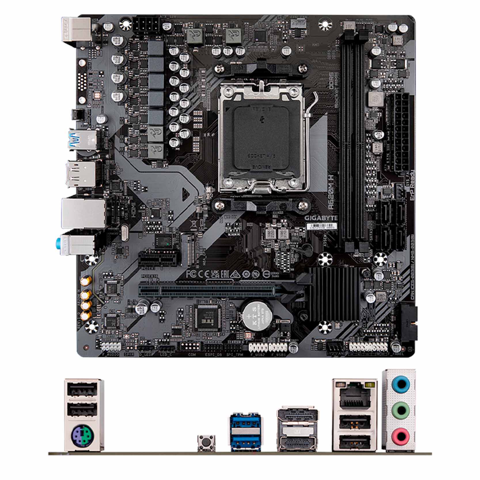 <table style="height: 1510px; width: 54.3192%;" border="1" width="371" cellspacing="1" cellpadding="1"> <tbody> <tr> <td style="width: 27.566%;" rowspan="1"><span style="font-size: 8pt;">MARCA</span></td> <td style="width: 72.434%;" colspan="3" height="21"><span style="font-size: 8pt;">GIGABYTE</span></td> </tr> <tr></tr> <tr> <td style="width: 27.566%;" rowspan="1"><span style="font-size: 8pt;">MODELO</span></td> <td style="width: 72.434%;" colspan="3" height="21"><span style="font-size: 8pt;">A620M H</span></td> </tr> <tr></tr> <tr> <td style="width: 27.566%;" rowspan="1"><span style="font-size: 8pt;">REVISION</span></td> <td style="width: 72.434%;" colspan="3" height="21"><span style="font-size: 8pt;">1.0</span></td> </tr> <tr></tr> <tr> <td style="width: 27.566%;" rowspan="1"><span style="font-size: 8pt;">CHIPSET</span></td> <td style="width: 72.434%;" colspan="3" height="21"><span style="font-size: 8pt;">AMD A620</span></td> </tr> <tr></tr> <tr> <td style="width: 27.566%;" rowspan="1"><span style="font-size: 8pt;">TIPO DE SOCKET</span></td> <td style="width: 72.434%;" colspan="3" height="21"><span style="font-size: 8pt;">AM5 AMD</span></td> </tr> <tr></tr> <tr> <td style="width: 27.566%;" rowspan="1"><span style="font-size: 8pt;">PROCESADORES</span></td> <td style="width: 28.2991%;" rowspan="1" height="21"><span style="font-size: 8pt;">AMD COMPATIBLE</span></td> <td style="width: 44.1349%;" colspan="2" height="21"><span style="font-size: 8pt;">Procesador AMD Ryzen 3 SAM5 8XXX</span><br><span style="font-size: 8pt;">Procesador AMD Ryzen 9 SAM5 8XXX</span><br><span style="font-size: 8pt;">Procesador AMD Ryzen 7 SAM5 8XXX</span><br><span style="font-size: 8pt;">Procesador AMD Ryzen 5 SAM5 8XXX</span><br><span style="font-size: 8pt;">Procesador AMD Ryzen 9 SAM5 7XXX</span><br><span style="font-size: 8pt;">Procesador AMD Ryzen 7 SAM5 7XXX</span><br><span style="font-size: 8pt;">Procesador AMD Ryzen 5 SAM5 7XXX</span></td> </tr> <tr></tr> <tr> <td style="width: 27.566%;" rowspan="5"><span style="font-size: 8pt;">MEMORIAS RAM</span></td> <td style="width: 28.2991%;" rowspan="1" height="21"><span style="font-size: 8pt;">COMPATIBLES</span></td> <td style="width: 44.1349%;" colspan="2" height="21"><span style="font-size: 8pt;">Memoria RAM DDR5 8200 MHz PC5-65600</span><br><span style="font-size: 8pt;">Memoria RAM DDR5 7600 MHz PC5-60800</span><br><span style="font-size: 8pt;">Memoria RAM DDR5 7200 MHz PC5-57600</span><br><span style="font-size: 8pt;">Memoria RAM DDR5 6800 MHz PC5-54400</span><br><span style="font-size: 8pt;">Memoria RAM DDR5 6400 MHz PC5-51200</span><br><span style="font-size: 8pt;">Memoria RAM DDR5 6000 MHz PC5-48000</span><br><span style="font-size: 8pt;">Memoria RAM DDR5 5600 MHz PC5-44800</span><br><span style="font-size: 8pt;">Memoria RAM DDR5 5200 MHz PC5-41600</span><br><span style="font-size: 8pt;">Memoria RAM DDR5 4800 MHz PC5-38400</span></td> </tr> <tr> <td style="width: 28.2991%;" rowspan="1" height="21"><span style="font-size: 8pt;">NUMERO DE SOCKETS DIMM</span></td> <td style="width: 44.1349%;" colspan="2" height="21"><span style="font-size: 8pt;">2</span></td> </tr> <tr> <td style="width: 28.2991%;" rowspan="1" height="21"><span style="font-size: 8pt;">EXPANSION MAXIMA EN GB</span></td> <td style="width: 44.1349%;" colspan="2" height="21"><span style="font-size: 8pt;">96</span></td> </tr> <tr> <td style="width: 28.2991%;" rowspan="1" height="21"><span style="font-size: 8pt;">TECNOLOGIA</span></td> <td style="width: 44.1349%;" colspan="2" height="21"><span style="font-size: 8pt;">AMD EXPO</span><br><span style="font-size: 8pt;">Intel XMP</span><br><span style="font-size: 8pt;">Dual Channel</span></td> </tr> <tr> <td style="width: 28.2991%;" rowspan="1" height="21"><span style="font-size: 8pt;">TIPO DE RAM</span></td> <td style="width: 44.1349%;" colspan="2" height="21"><span style="font-size: 8pt;">DDR5</span></td> </tr> <tr></tr> <tr> <td style="width: 27.566%;" rowspan="1"><span style="font-size: 8pt;">VIDEO</span></td> <td style="width: 72.434%;" colspan="3" height="21"><span style="font-size: 8pt;">Revisar caracteristicas del Procesador</span></td> </tr> <tr></tr> <tr> <td style="width: 27.566%;" rowspan="3"><span style="font-size: 8pt;">SONIDO</span></td> <td style="width: 28.2991%;" rowspan="1" height="21"><span style="font-size: 8pt;">TECNOLOGIA</span></td> <td style="width: 44.1349%;" colspan="2" height="21"><span style="font-size: 8pt;">High Definition (HD)</span></td> </tr> <tr> <td style="width: 28.2991%;" rowspan="1" height="21"><span style="font-size: 8pt;">CHIPSET</span></td> <td style="width: 44.1349%;" colspan="2" height="21"><span style="font-size: 8pt;">Realtek Audio Codec</span></td> </tr> <tr> <td style="width: 28.2991%;" rowspan="1" height="21"><span style="font-size: 8pt;">CANALES</span></td> <td style="width: 44.1349%;" colspan="2" height="21"><span style="font-size: 8pt;">7.1</span></td> </tr> <tr></tr> <tr> <td style="width: 27.566%;" rowspan="2"><span style="font-size: 8pt;">CONECTIVIDAD</span></td> <td style="width: 28.2991%;" rowspan="2" height="21"><span style="font-size: 8pt;">ETHERNET</span></td> <td style="width: 26.5396%;" rowspan="1" height="21"><span style="font-size: 8pt;">CHIPSET</span></td> <td style="width: 17.5953%;" colspan="1" height="21"><span style="font-size: 8pt;">Realtek 1GbE</span></td> </tr> <tr> <td style="width: 26.5396%;" rowspan="1" height="21"><span style="font-size: 8pt;">VELOCIDAD</span></td> <td style="width: 17.5953%;" colspan="1" height="21"><span style="font-size: 8pt;">10 Mbps</span><br><span style="font-size: 8pt;">100 Mbps</span><br><span style="font-size: 8pt;">1000 Mbps</span></td> </tr> <tr></tr> <tr> <td style="width: 27.566%;" rowspan="3"><span style="font-size: 8pt;">ALMACENAMIENTO SERIAL ATA</span></td> <td style="width: 28.2991%;" rowspan="1" height="21"><span style="font-size: 8pt;">NUMERO DE PUERTOS</span></td> <td style="width: 44.1349%;" colspan="2" height="21"><span style="font-size: 8pt