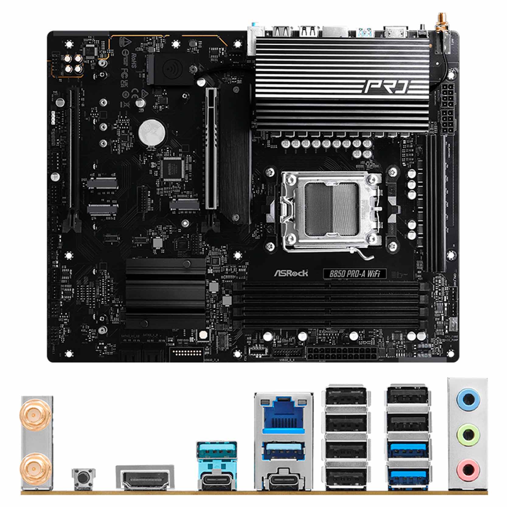 <table style="height: 2176px; width: 54.7584%;" border="1" width="374" cellspacing="1" cellpadding="1"> <tbody> <tr> <td style="width: 27.566%;" rowspan="1"><span style="font-size: 8pt;">MARCA</span></td> <td style="width: 72.2874%;" colspan="3" height="21"><span style="font-size: 8pt;">ASROCK</span></td> </tr> <tr></tr> <tr> <td style="width: 27.566%;" rowspan="1"><span style="font-size: 8pt;">MODELO</span></td> <td style="width: 72.2874%;" colspan="3" height="21"><span style="font-size: 8pt;">B850 Pro-A WiFi</span></td> </tr> <tr></tr> <tr> <td style="width: 27.566%;" rowspan="1"><span style="font-size: 8pt;">CHIPSET</span></td> <td style="width: 72.2874%;" colspan="3" height="21"><span style="font-size: 8pt;">AMD B850</span></td> </tr> <tr></tr> <tr> <td style="width: 27.566%;" rowspan="1"><span style="font-size: 8pt;">TIPO DE SOCKET</span></td> <td style="width: 72.2874%;" colspan="3" height="21"><span style="font-size: 8pt;">AM5 AMD</span></td> </tr> <tr></tr> <tr> <td style="width: 27.566%;" rowspan="1"><span style="font-size: 8pt;">PROCESADORES</span></td> <td style="width: 28.2991%;" rowspan="1" height="21"><span style="font-size: 8pt;">AMD COMPATIBLE</span></td> <td style="width: 43.9883%;" colspan="2" height="21"><span style="font-size: 8pt;">Procesador AMD Ryzen 9 SAM5 9XXX</span><br><span style="font-size: 8pt;">Procesador AMD Ryzen 7 SAM5 9XXX</span><br><span style="font-size: 8pt;">Procesador AMD Ryzen 5 SAM5 9XXX</span><br><span style="font-size: 8pt;">Procesador AMD Ryzen 3 SAM5 9XXX</span><br><span style="font-size: 8pt;">Procesador AMD Ryzen 3 SAM5 8XXX</span><br><span style="font-size: 8pt;">Procesador AMD Ryzen 9 SAM5 8XXX</span><br><span style="font-size: 8pt;">Procesador AMD Ryzen 7 SAM5 8XXX</span><br><span style="font-size: 8pt;">Procesador AMD Ryzen 5 SAM5 8XXX</span><br><span style="font-size: 8pt;">Procesador AMD Ryzen 9 SAM5 7XXX</span><br><span style="font-size: 8pt;">Procesador AMD Ryzen 7 SAM5 7XXX</span><br><span style="font-size: 8pt;">Procesador AMD Ryzen 5 SAM5 7XXX</span></td> </tr> <tr></tr> <tr> <td style="width: 27.566%;" rowspan="5"><span style="font-size: 8pt;">MEMORIAS RAM</span></td> <td style="width: 28.2991%;" rowspan="1" height="21"><span style="font-size: 8pt;">COMPATIBLES</span></td> <td style="width: 43.9883%;" colspan="2" height="21"><span style="font-size: 8pt;">Memoria RAM DDR5 8200 MHz PC5-65600</span><br><span style="font-size: 8pt;">Memoria RAM DDR5 7600 MHz PC5-60800</span><br><span style="font-size: 8pt;">Memoria RAM DDR5 7200 MHz PC5-57600</span><br><span style="font-size: 8pt;">Memoria RAM DDR5 6800 MHz PC5-54400</span><br><span style="font-size: 8pt;">Memoria RAM DDR5 6400 MHz PC5-51200</span><br><span style="font-size: 8pt;">Memoria RAM DDR5 6000 MHz PC5-48000</span><br><span style="font-size: 8pt;">Memoria RAM DDR5 5600 MHz PC5-44800</span><br><span style="font-size: 8pt;">Memoria RAM DDR5 5200 MHz PC5-41600</span><br><span style="font-size: 8pt;">Memoria RAM DDR5 4800 MHz PC5-38400</span></td> </tr> <tr> <td style="width: 28.2991%;" rowspan="1" height="21"><span style="font-size: 8pt;">NUMERO DE SOCKETS DIMM</span></td> <td style="width: 43.9883%;" colspan="2" height="21"><span style="font-size: 8pt;">4</span></td> </tr> <tr> <td style="width: 28.2991%;" rowspan="1" height="21"><span style="font-size: 8pt;">EXPANSION MAXIMA EN GB</span></td> <td style="width: 43.9883%;" colspan="2" height="21"><span style="font-size: 8pt;">196</span></td> </tr> <tr> <td style="width: 28.2991%;" rowspan="1" height="21"><span style="font-size: 8pt;">TECNOLOGIA</span></td> <td style="width: 43.9883%;" colspan="2" height="21"><span style="font-size: 8pt;">AMD EXPO</span><br><span style="font-size: 8pt;">Intel XMP</span><br><span style="font-size: 8pt;">Dual Channel</span></td> </tr> <tr> <td style="width: 28.2991%;" rowspan="1" height="21"><span style="font-size: 8pt;">TIPO DE RAM</span></td> <td style="width: 43.9883%;" colspan="2" height="21"><span style="font-size: 8pt;">DDR5</span></td> </tr> <tr></tr> <tr> <td style="width: 27.566%;" rowspan="1"><span style="font-size: 8pt;">VIDEO</span></td> <td style="width: 72.2874%;" colspan="3" height="21"><span style="font-size: 8pt;">Revisar caracteristicas del Procesador</span></td> </tr> <tr></tr> <tr> <td style="width: 27.566%;" rowspan="3"><span style="font-size: 8pt;">SONIDO</span></td> <td style="width: 28.2991%;" rowspan="1" height="21"><span style="font-size: 8pt;">TECNOLOGIA</span></td> <td style="width: 43.9883%;" colspan="2" height="21"><span style="font-size: 8pt;">High Definition Audio</span></td> </tr> <tr> <td style="width: 28.2991%;" rowspan="1" height="21"><span style="font-size: 8pt;">CHIPSET</span></td> <td style="width: 43.9883%;" colspan="2" height="21"><span style="font-size: 8pt;">Realtek ALC897 Codec</span></td> </tr> <tr> <td style="width: 28.2991%;" rowspan="1" height="21"><span style="font-size: 8pt;">CANALES</span></td> <td style="width: 43.9883%;" colspan="2" height="21"><span style="font-size: 8pt;">7.1</span></td> </tr> <tr></tr> <tr> <td style="width: 27.566%;" rowspan="6"><span style="font-size: 8pt;">CONECTIVIDAD</span></td> <td style="width: 28.2991%;" rowspan="2" height="21"><span style="font-size: 8pt;">ETHERNET</span></td> <td style="width: 29.4721%;" rowspan="1" height="21"><span style="font-size: 8pt;">CHIPSET</span></td> <td style="width: 14.5161%;" colspan="1" height="21"><span style="font-size: 8pt;">Realtek RTL8125BG</span></td> </tr> <tr> <td style="width: 29.4721%;" rowspan="1" height="21"><span style="font-size: 8pt;">VELOCIDAD</span></td> <td style="width: 14.5161%;" colspan="1" height="21"><span style="font-size: 8pt;">10 Mbps</span><br><span style="font-size: 8pt;">100 Mbps</span><br><span style="font-size: 8pt;">1000 Mbps</span><br><span style="font-size: 8pt;">2500 Mbps</span></td> </tr> <tr> <td style="width: 28.2991%;" rowspan="3" height="21"><span style="font-size: 8pt;">WIRELESS</span></td> <td style="width: 29.4721%;" rowspan="1" height="21"><sp