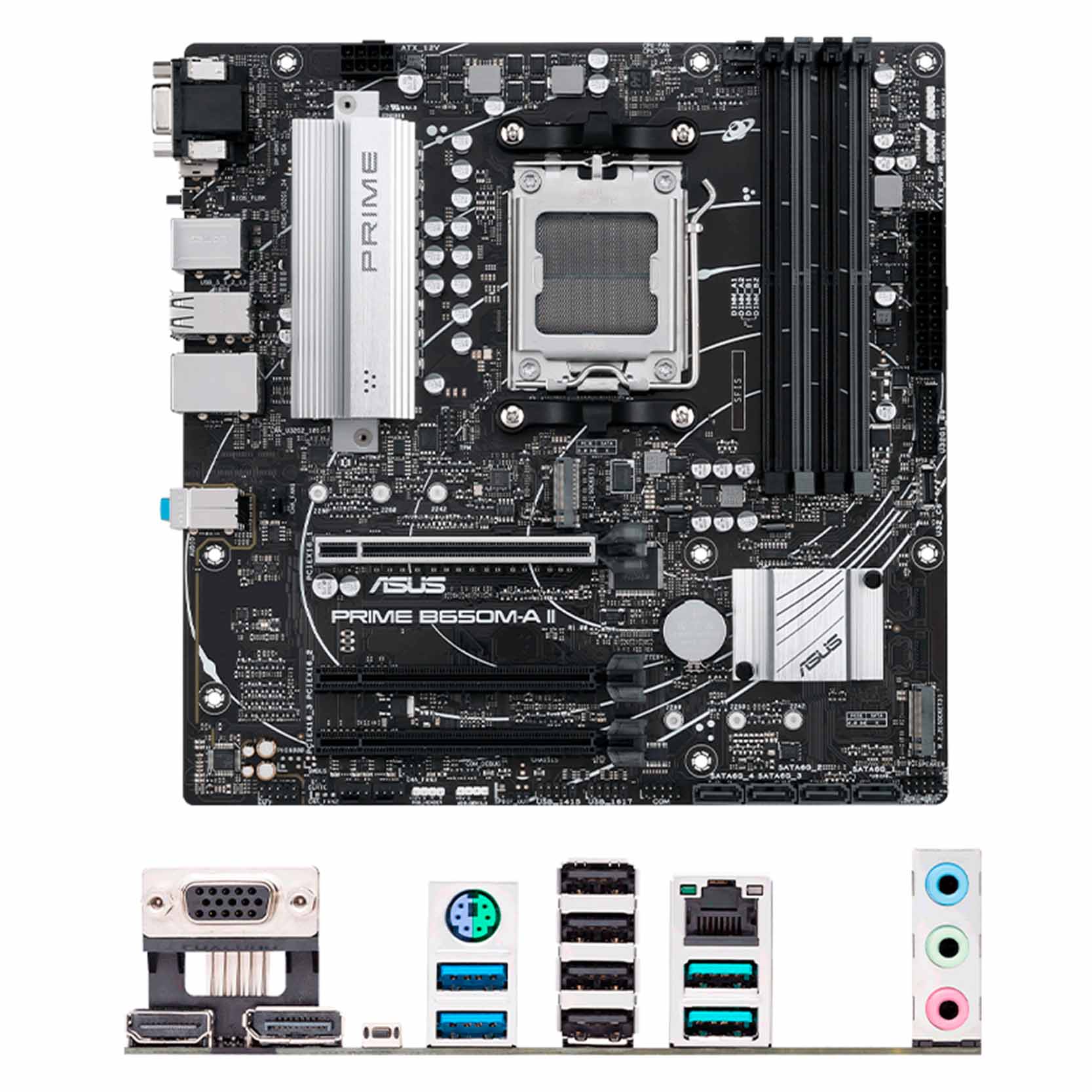 <table style="height: 1809px; width: 54.1728%;" border="1" width="370" cellspacing="1" cellpadding="1"> <tbody> <tr> <td style="width: 25.2199%;" rowspan="1"><span style="font-size: 8pt;">MARCA</span></td> <td style="width: 74.7801%;" colspan="3" height="21"><span style="font-size: 8pt;">ASUS</span></td> </tr> <tr></tr> <tr> <td style="width: 25.2199%;" rowspan="1"><span style="font-size: 8pt;">MODELO</span></td> <td style="width: 74.7801%;" colspan="3" height="21"><span style="font-size: 8pt;">PRIME B650M-A II</span></td> </tr> <tr></tr> <tr> <td style="width: 25.2199%;" rowspan="1"><span style="font-size: 8pt;">CHIPSET</span></td> <td style="width: 74.7801%;" colspan="3" height="21"><span style="font-size: 8pt;">AMD B650</span></td> </tr> <tr></tr> <tr> <td style="width: 25.2199%;" rowspan="1"><span style="font-size: 8pt;">TIPO DE SOCKET</span></td> <td style="width: 74.7801%;" colspan="3" height="21"><span style="font-size: 8pt;">AM5 AMD</span></td> </tr> <tr></tr> <tr> <td style="width: 25.2199%;" rowspan="1"><span style="font-size: 8pt;">PROCESADORES</span></td> <td style="width: 25.9531%;" rowspan="1" height="21"><span style="font-size: 8pt;">AMD COMPATIBLE</span></td> <td style="width: 48.827%;" colspan="2" height="21"><span style="font-size: 8pt;">Procesador AMD Ryzen 9 SAM5 9XXX</span><br><span style="font-size: 8pt;">Procesador AMD Ryzen 7 SAM5 9XXX</span><br><span style="font-size: 8pt;">Procesador AMD Ryzen 5 SAM5 9XXX</span><br><span style="font-size: 8pt;">Procesador AMD Ryzen 3 SAM5 9XXX</span><br><span style="font-size: 8pt;">Procesador AMD Ryzen 3 SAM5 8XXX</span><br><span style="font-size: 8pt;">Procesador AMD Ryzen 9 SAM5 8XXX</span><br><span style="font-size: 8pt;">Procesador AMD Ryzen 7 SAM5 8XXX</span><br><span style="font-size: 8pt;">Procesador AMD Ryzen 5 SAM5 8XXX</span><br><span style="font-size: 8pt;">Procesador AMD Ryzen 9 SAM5 7XXX</span><br><span style="font-size: 8pt;">Procesador AMD Ryzen 7 SAM5 7XXX</span><br><span style="font-size: 8pt;">Procesador AMD Ryzen 5 SAM5 7XXX</span></td> </tr> <tr></tr> <tr> <td style="width: 25.2199%;" rowspan="5"><span style="font-size: 8pt;">MEMORIAS RAM</span></td> <td style="width: 25.9531%;" rowspan="1" height="21"><span style="font-size: 8pt;">COMPATIBLES</span></td> <td style="width: 48.827%;" colspan="2" height="21"><span style="font-size: 8pt;">Memoria RAM DDR5 8200 MHz PC5-65600</span><br><span style="font-size: 8pt;">Memoria RAM DDR5 7600 MHz PC5-60800</span><br><span style="font-size: 8pt;">Memoria RAM DDR5 7200 MHz PC5-57600</span><br><span style="font-size: 8pt;">Memoria RAM DDR5 6800 MHz PC5-54400</span><br><span style="font-size: 8pt;">Memoria RAM DDR5 6400 MHz PC5-51200</span><br><span style="font-size: 8pt;">Memoria RAM DDR5 6000 MHz PC5-48000</span><br><span style="font-size: 8pt;">Memoria RAM DDR5 5600 MHz PC5-44800</span><br><span style="font-size: 8pt;">Memoria RAM DDR5 5200 MHz PC5-41600</span><br><span style="font-size: 8pt;">Memoria RAM DDR5 4800 MHz PC5-38400</span></td> </tr> <tr> <td style="width: 25.9531%;" rowspan="1" height="21"><span style="font-size: 8pt;">NUMERO DE SOCKETS DIMM</span></td> <td style="width: 48.827%;" colspan="2" height="21"><span style="font-size: 8pt;">4</span></td> </tr> <tr> <td style="width: 25.9531%;" rowspan="1" height="21"><span style="font-size: 8pt;">EXPANSION MAXIMA EN GB</span></td> <td style="width: 48.827%;" colspan="2" height="21"><span style="font-size: 8pt;">192</span></td> </tr> <tr> <td style="width: 25.9531%;" rowspan="1" height="21"><span style="font-size: 8pt;">TECNOLOGIA</span></td> <td style="width: 48.827%;" colspan="2" height="21"><span style="font-size: 8pt;">AMD EXPO</span><br><span style="font-size: 8pt;">Dual Channel</span><br><span style="font-size: 8pt;">OptiMem II</span></td> </tr> <tr> <td style="width: 25.9531%;" rowspan="1" height="21"><span style="font-size: 8pt;">TIPO DE RAM</span></td> <td style="width: 48.827%;" colspan="2" height="21"><span style="font-size: 8pt;">DDR5</span></td> </tr> <tr></tr> <tr> <td style="width: 25.2199%;" rowspan="1"><span style="font-size: 8pt;">VIDEO</span></td> <td style="width: 74.7801%;" colspan="3" height="21"><span style="font-size: 8pt;">Revisar caracteristicas del Procesador</span></td> </tr> <tr></tr> <tr> <td style="width: 25.2199%;" rowspan="3"><span style="font-size: 8pt;">SONIDO</span></td> <td style="width: 25.9531%;" rowspan="1" height="21"><span style="font-size: 8pt;">TECNOLOGIA</span></td> <td style="width: 48.827%;" colspan="2" height="21"><span style="font-size: 8pt;">Realtek 7.1 Surround Sound High Definition</span></td> </tr> <tr> <td style="width: 25.9531%;" rowspan="1" height="21"><span style="font-size: 8pt;">CHIPSET</span></td> <td style="width: 48.827%;" colspan="2" height="21"><span style="font-size: 8pt;">Realtek Audio Codec</span></td> </tr> <tr> <td style="width: 25.9531%;" rowspan="1" height="21"><span style="font-size: 8pt;">CANALES</span></td> <td style="width: 48.827%;" colspan="2" height="21"><span style="font-size: 8pt;">7.1</span></td> </tr> <tr></tr> <tr> <td style="width: 25.2199%;" rowspan="2"><span style="font-size: 8pt;">CONECTIVIDAD</span></td> <td style="width: 25.9531%;" rowspan="2" height="21"><span style="font-size: 8pt;">ETHERNET</span></td> <td style="width: 24.1935%;" rowspan="1" height="21"><span style="font-size: 8pt;">CHIPSET</span></td> <td style="width: 24.6334%;" colspan="1" height="21"><span style="font-size: 8pt;">Realtek 2.5Gb</span></td> </tr> <tr> <td style="width: 24.1935%;" rowspan="1" height="21"><span style="font-size: 8pt;">VELOCIDAD</span></td> <td style="width: 24.6334%;" colspan="1" height="21"><span style="font-size: 8pt;">100 Mbps</span><br><span style="font-size: 8pt;">1000 Mbps</span><br><span style="font-size: 8pt;">2500 Mbps</span></td> </tr> <tr></tr> <tr> <td style="width: 25.2199%;" rowspan="3"><span style="font-size: 8pt;">ALMACENAMIENTO SERIAL ATA</span></td> <td style="width: 25.9531%;" rowspan="1" height="21"><span style="font-si